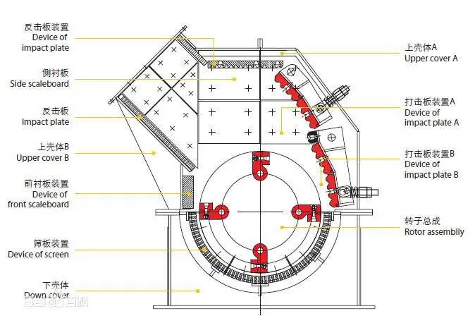 Struktura jest prosta i składa się z obudowy, wirnika i płyty uderzeniowej. Główną częścią roboczą kruszarki udarowej jest szybki wirnik obrotowy z młotkiem płytowym. Podczas procesu uderzenia wzajemnego bloki materiałowe również zderzają się ze sobą. Gdy materiał jest trafiony młotkiem płytowym, wpływ płyty uderzeniowej i kolizja między sobą, pęknięcia i rozluźnienie są stale generowane w środku, co ostatecznie prowadzi do kruszenia. Urządzenie udarowe służy do wytrzymania materiału uderzonego przez młot płyty i odbicie go. Głównym elementem jest płyta uderzenia, która jest spawana stalowymi płytkami. Na jego powierzchni uderzenia znajdują się odporne na zużycie podszewki, a niektóre używają słupków uderzeniowych lub płyt siatkowych.